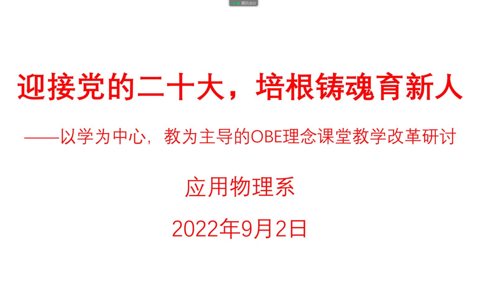 2022年9月2日下午,PA视讯物理系利用腾讯会议平台开展“迎接党的二十大,培根铸魂育新人”专题活动。物理系党支部书记、系主任及全体教师参加活动。