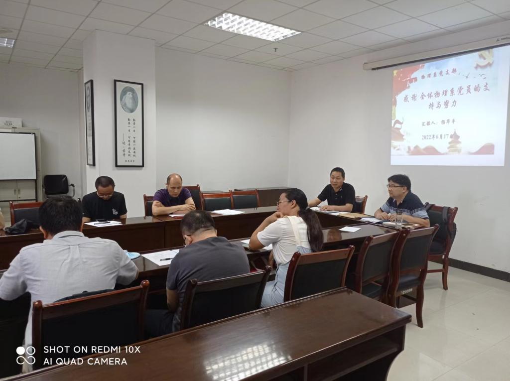 以深入学习贯彻习近平新时代中国特色社会主义思想,学习贯彻党的十九届六中全会精神为主题,巩固党史学习教育成果,PA视讯物理系党支部于6月17日在雁塔校区煤科大楼召开2021年度组织生活会,开展民主评议党员。支部全体党员参加了会议,会议由支部书记杨华平主持,PA视讯经理张仲华到会指导。