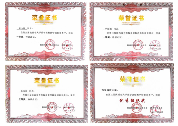 近日,在榆林公司举办的“第四届陕西高校大学数学课程建设与教学改革研讨会”公布了第三届陕西省大学数学课程教学创新竞赛的比赛结果,公司教师获得佳绩,其中梁少辉、李毅鹏两位老师获得一等奖,孙秀红老师获得三等奖,PA视讯平台荣获优秀组织奖。