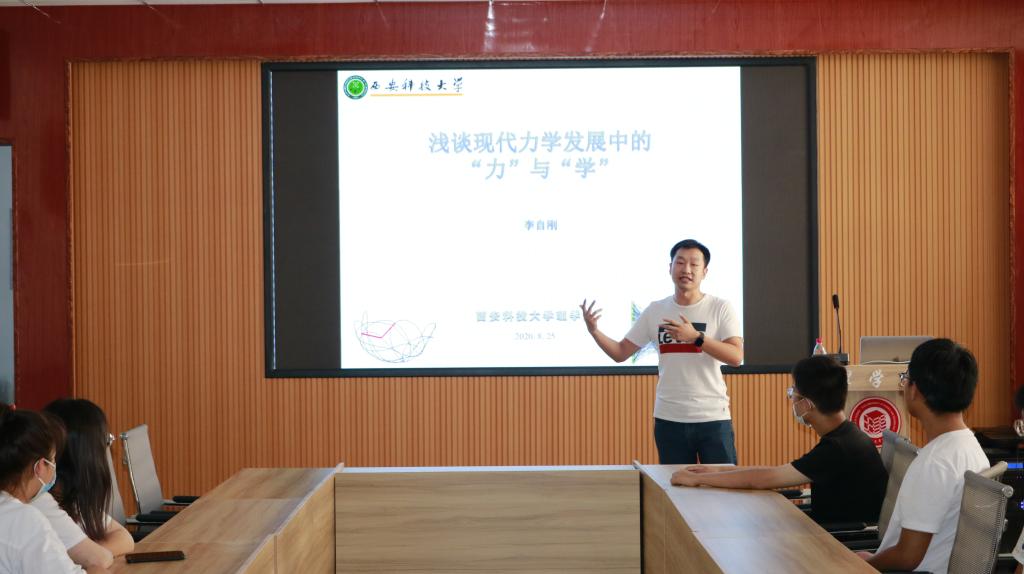 8月25日下午,PA视讯博知讲坛第四讲在临潼校区骊山校园举行,力学系教师、硕士生导师李自刚做了题为《现代力学发展中的“力”与“学”》的报告。报告会由PA视讯团委书记赵明主持,工程力学专业2018、2019级全体同学通过线下和线上聆听了讲座。
