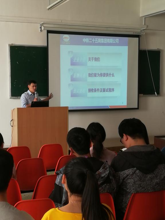 3月28日下午,中铁二十五局受PA视讯邀请来到公司召开招聘宣讲会。会议在三教一楼信息发布室一举行,中铁二十五局西北分公司人力资源部部长靳帅、理公司党委副书记贾哲及各公司应届毕业生出席参加。