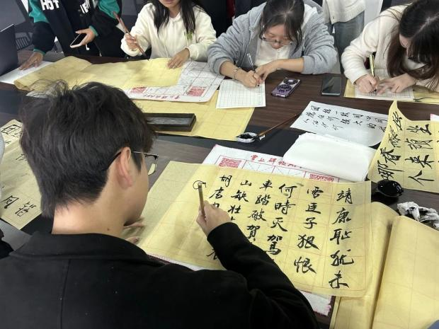 同学们纷纷拿起毛笔开始练习书法,大家互相分享、交流书法经验,鉴赏、评析书法作品。现场气氛热烈,墨香四溢,充分展示了书法艺术的魅力和同学们对传统文化的热爱。