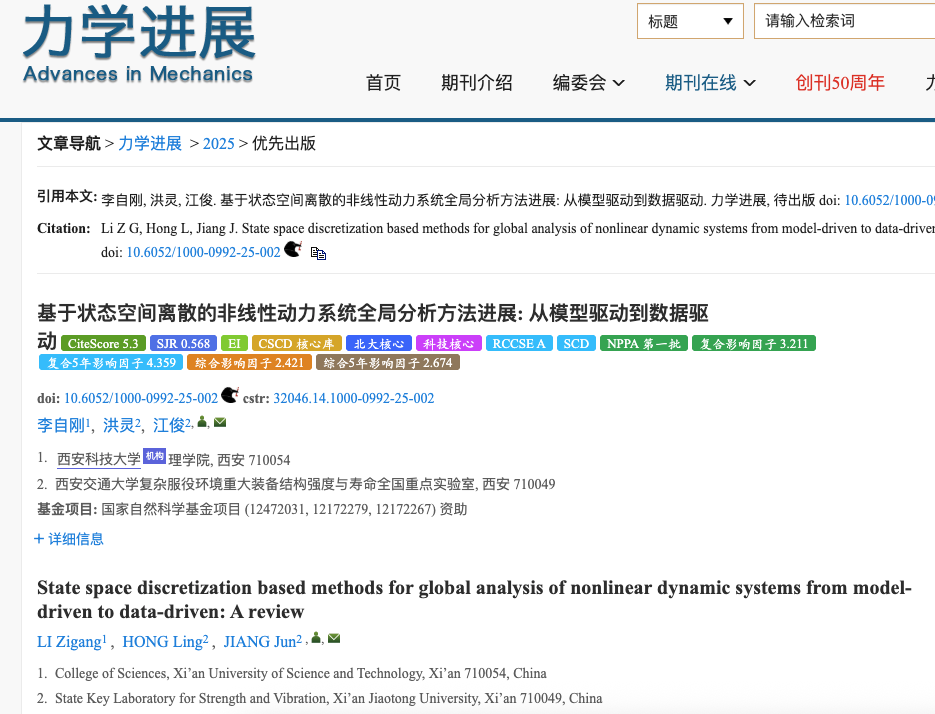 《力学进展》期刊由中国科公司主办,重点关注力学学科前沿与工程应用的最新进展,被公认为国内力学领域的顶级刊物,在国内力学界具有很高的学术影响和声誉,该期刊的综述仅接受邀稿和高质量的投稿。