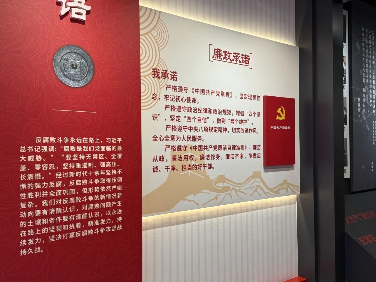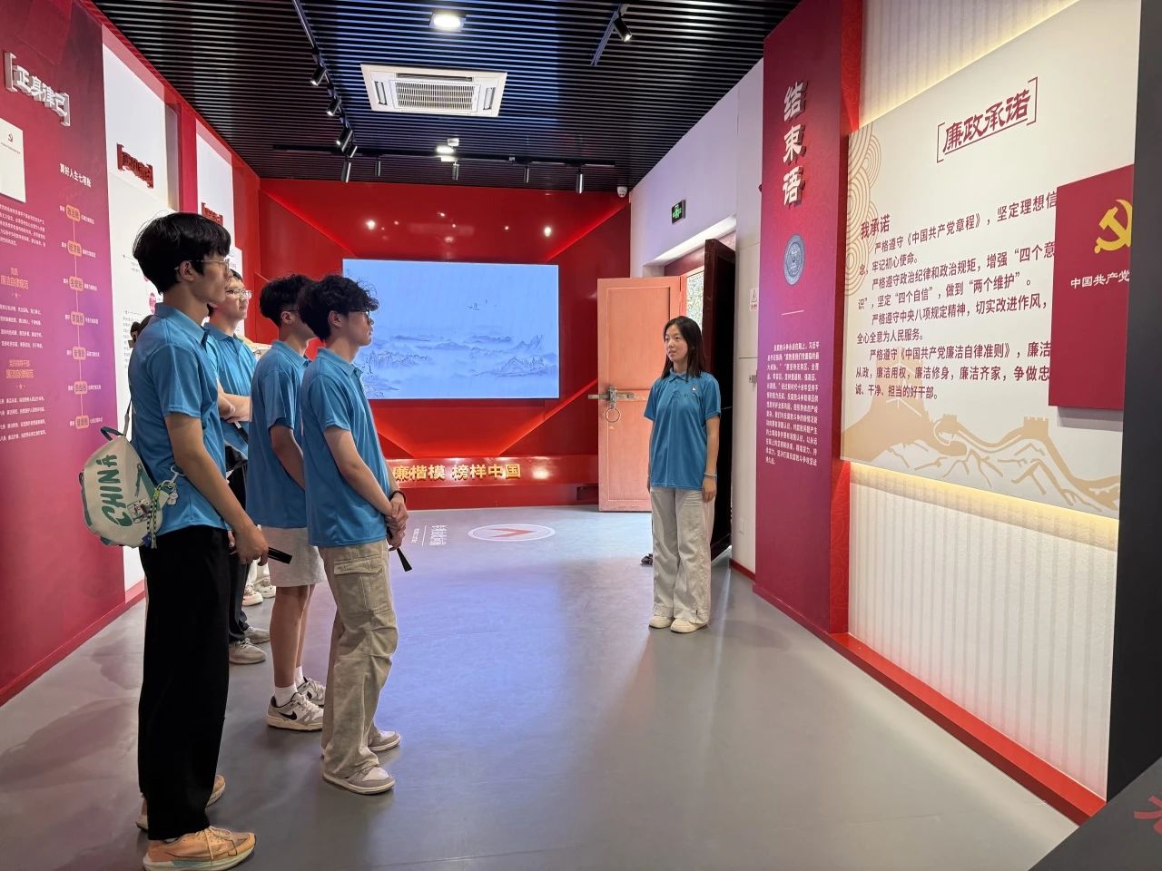 在数学与应用数学2402班王沂廷的带领下,全体同学庄严进行廉政承诺:“严格遵守《中国共产党章程》,坚定理想信念,牢记初心使命。严格遵守政治纪律和政治规矩,增强‘四个意识’,坚定‘四个自信’,做到‘两个维护’。” 铿锵有力的誓言回荡在博物馆内,不仅是同学们对廉洁自律的郑重承诺,更是将杨震精神内化于心、外化于行的生动体现。