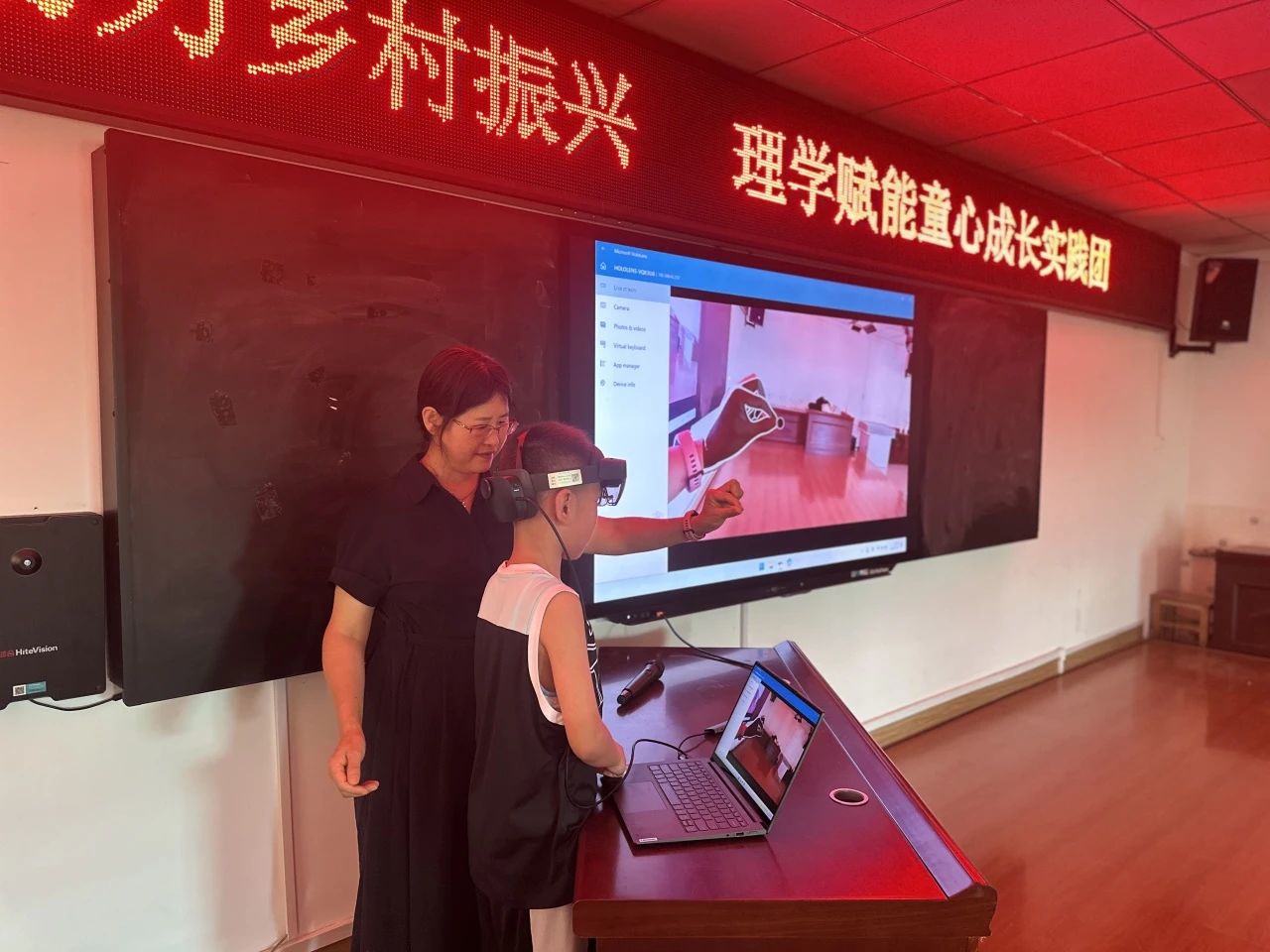 为了让孩子们更直观地感受MR技术的魅力,刘佳老师邀请同学们上台亲身体验。当孩子们戴上MR设备,看到虚拟与现实完美融合的奇妙场景时,不禁发出阵阵惊叹。他们兴奋地与虚拟物体进行互动,仿佛置身于一个全新的世界。在体验过程中,刘佳老师耐心地为孩子们解答疑问,引导他们思考MR技术在未来生活中的更多可能性。