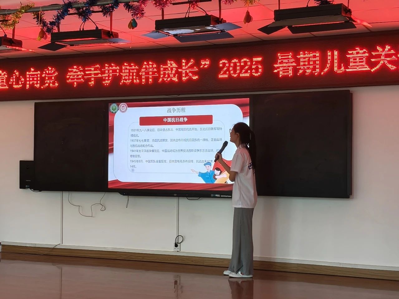 杨瑞欣同学以中国抗日战争胜利暨世界反法西斯战争胜利80周年为主题,为同学们带来了一场生动的爱国主义教育宣讲。宣讲过程中,杨瑞欣同学通过讲述历史故事、展示珍贵图片等方式,带领孩子们重温那段波澜壮阔的历史,让孩子们深刻感受到了革命先辈们的英勇无畏和爱国精神。为了增强互动性,杨瑞欣同学还设置了问答环节,孩子们积极踊跃发言,现场气氛热烈。对于回答正确的孩子,实践团精心准备了小奖品,以鼓励他们对历史知识的学习热情。