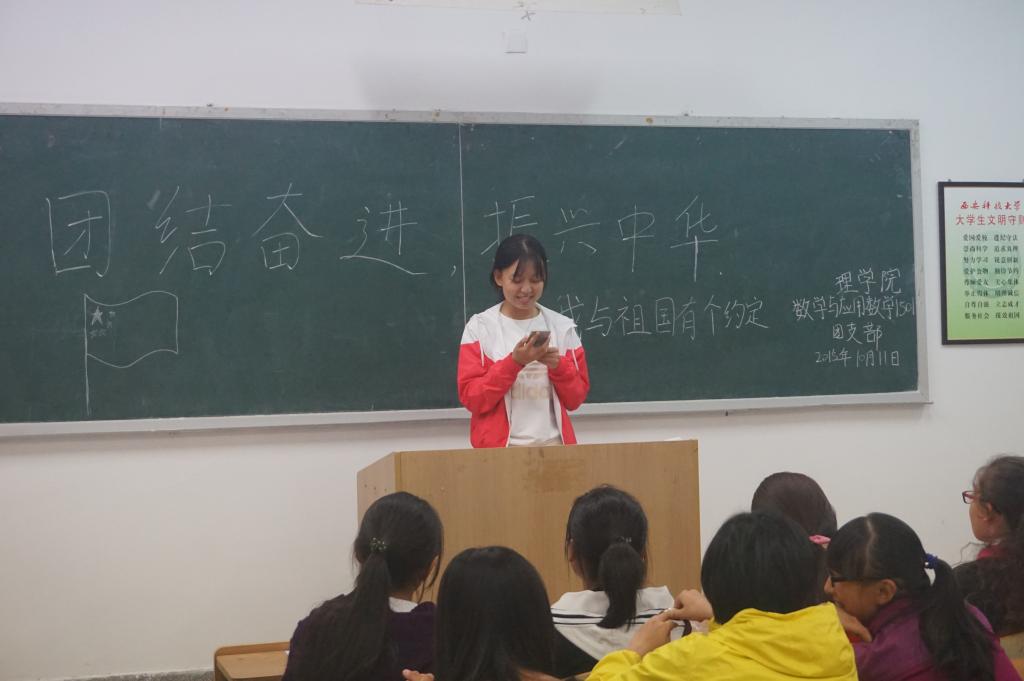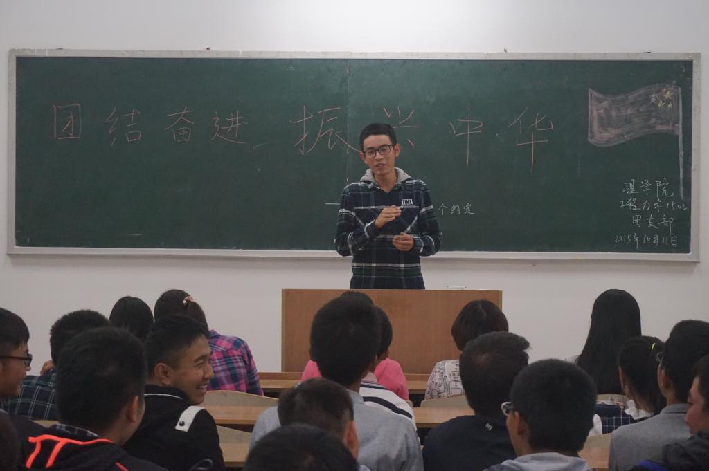 10月11日晚7:15PA视讯15级同学今晚开展了他们老员工涯的第一次团日活动,团日活动的主题是“团结奋进,振兴中华——我与祖国有个约定”,虽然给他们的准备时间不多,但他们仍是做出了一份让人满意的团日活动。